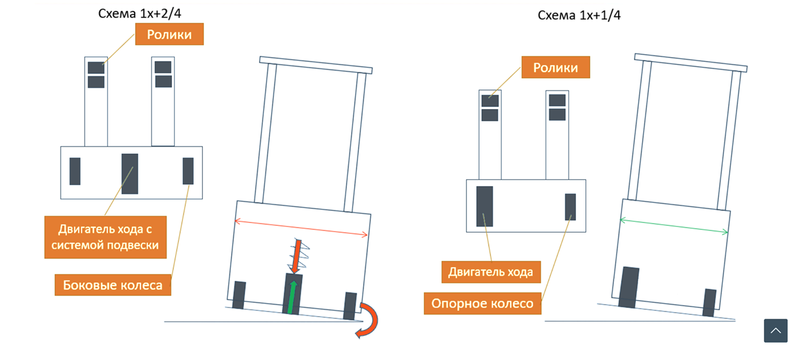 опорные колеса справа и слева для снижения раскачки. Такая схема встречается у штабелёров