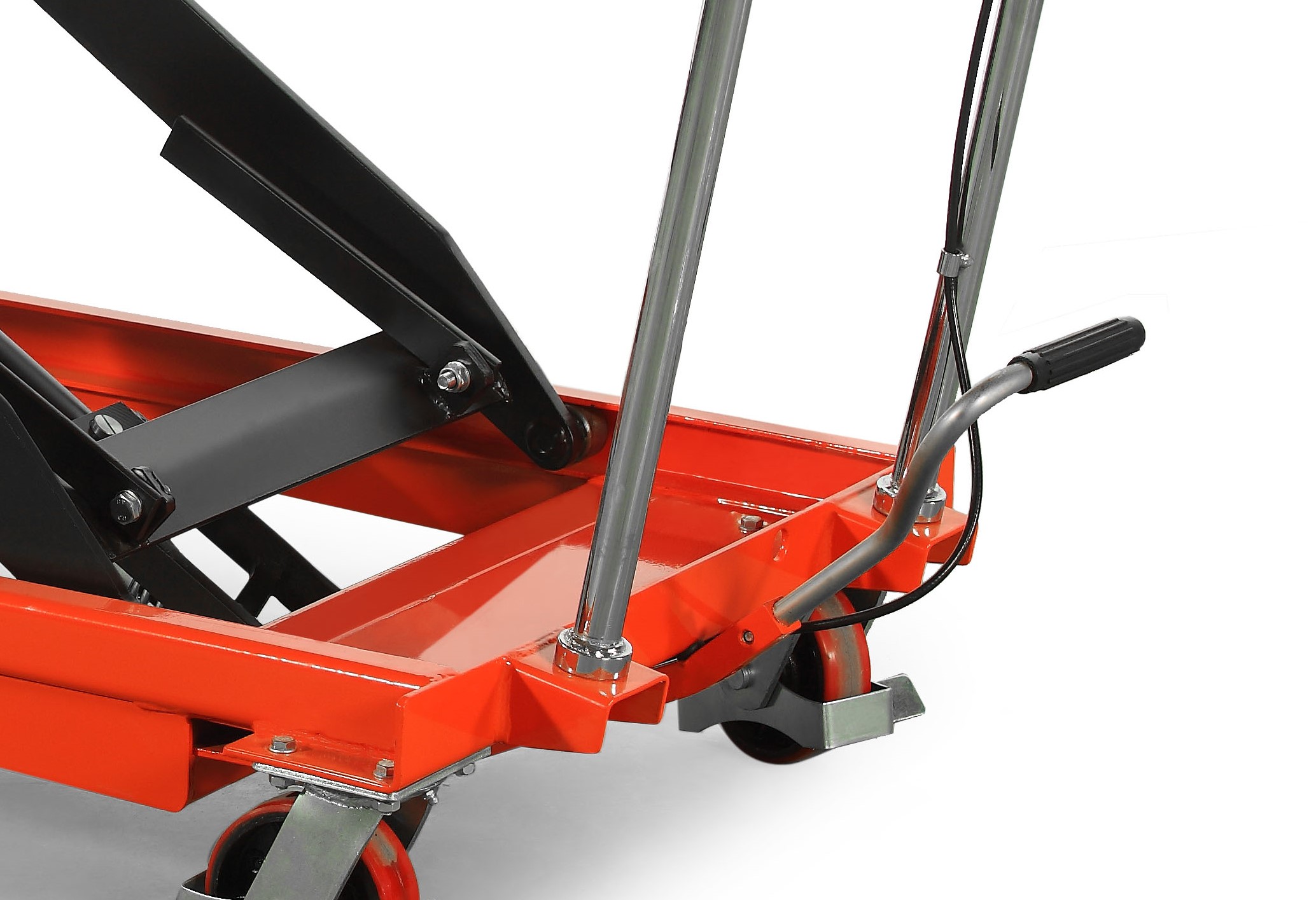 Тележка оснащена прочной платформой, надежным гидроцилиндром, поворотными и неподвижными колесами, а также встроенной педалью подъема и рычагом спуска. Благодаря ножничному механизму обеспечивается плавный подъем и опускание груза.