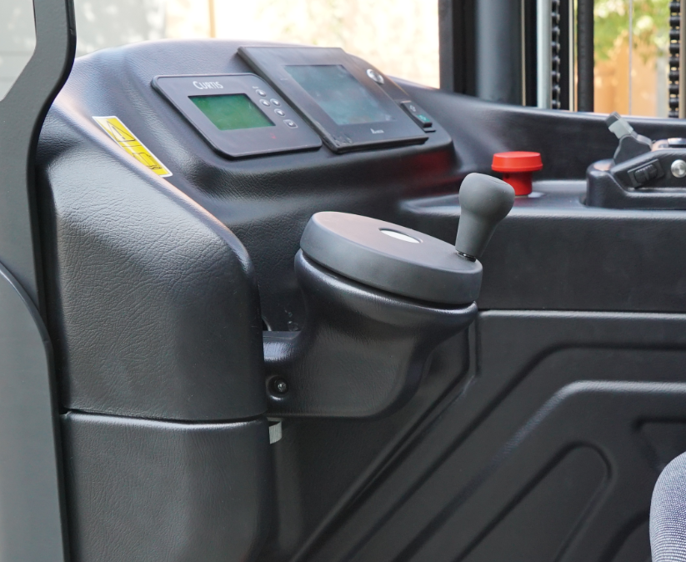 Компактная конструкция штабелёра и минимальный радиус разворота 1,84 метра позволяют легко выполнять манёвры в узких проходах и на ограниченных площадях. Точное управление движением и подъемом осуществляется с помощью эргономичного джойстика, обеспечивающего плавный и предсказуемый отклик. Это особенно важно при работе с дорогими или хрупкими грузами, где требуется высокая точность позиционирования.