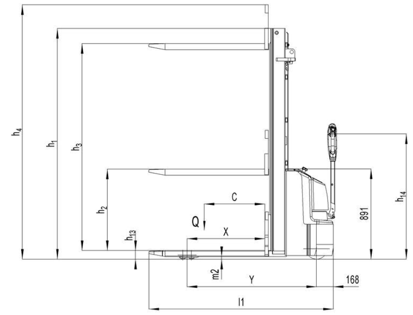 | Высота подъема h3 (мм) | Высота свободного подъема h2 (мм) | Габаритная высота мачты минимальная h1 (мм) | Высота вил максимальная h3 + h13 (мм) | Габаритная высота мачты максимальная h4 (мм) | |