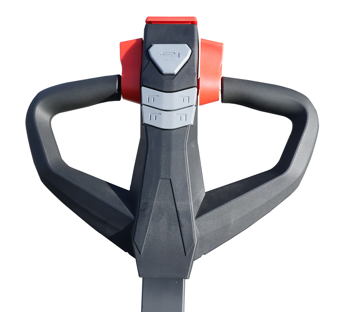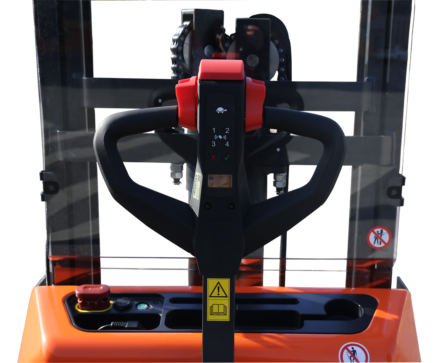 Рукоятка с интегрированными кнопками и переключателями позволяет управлять движением, подъёмом и опусканием груза одной рукой. Все элементы расположены так, чтобы оператор мог работать длительное время без усталости.