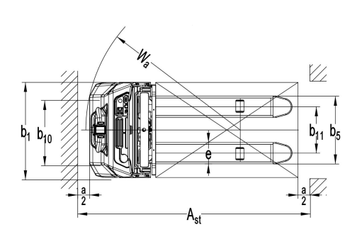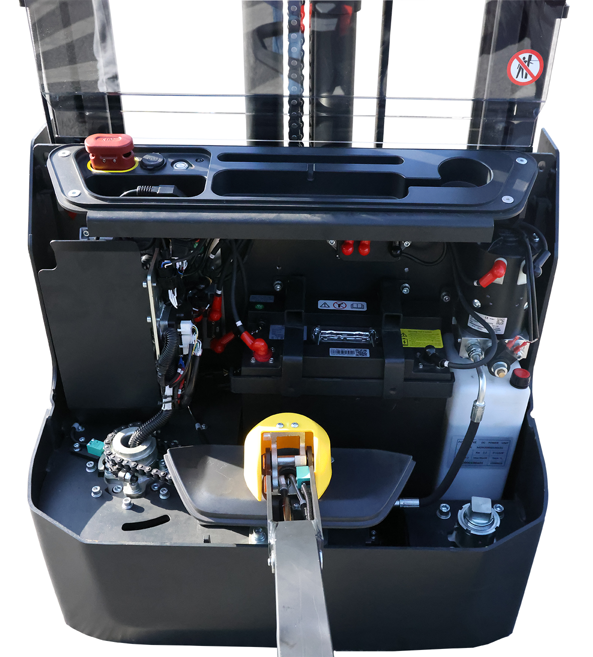 Конструкция штабелёра спроектирована так, чтобы обеспечивать максимальную маневренность даже при ограниченном пространстве. Небольшая ширина корпуса и оптимальный радиус разворота позволяют без труда перемещаться между стеллажами, экономя время при работе в плотной складской застройке.