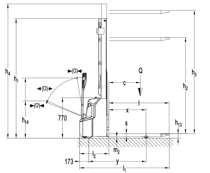 Высота подъема h3 (мм) Высота свободного подъема h2 (мм) Габаритная высота мачты минимальная h1 (мм) Высота вил максимальная h3 + h13 (мм) Габаритная высота мачты максимальная h4 (мм)