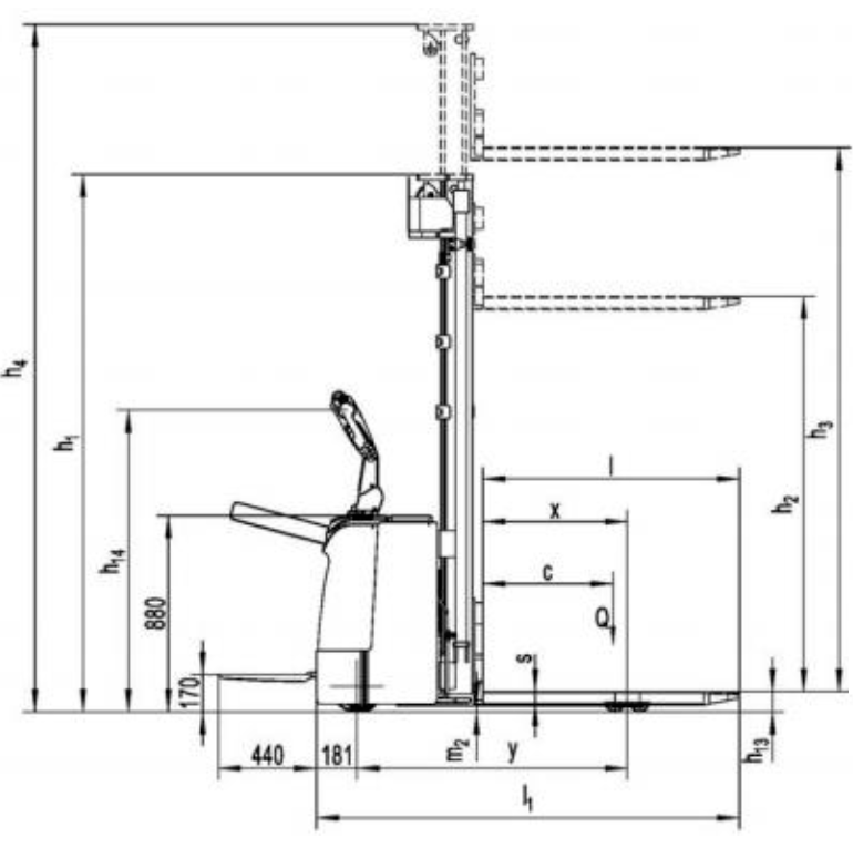 | Высота подъема h3 (мм) | Высота свободного подъема h2 (мм) | Габаритная высота мачты минимальная h1 (мм) | Высота вил максимальная h3 + h13 (мм) | Габаритная высота мачты максимальная h4 (мм) | |