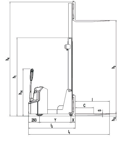 | Высота подъема h3 (мм) | Габаритная высота мачты минимальная h1 (мм) | Высота вил максимальная h3 + h13 (мм) | Габаритная высота мачты максимальная h4 (мм) | |
