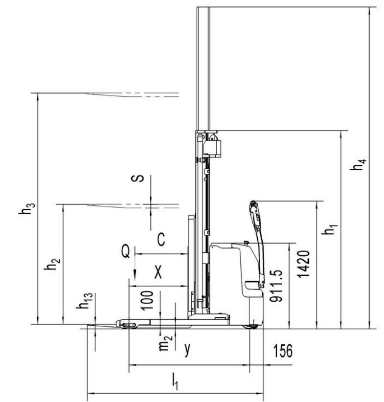 | Высота подъема h3 (мм) | Высота свободного подъема h2 (мм) | Габаритная высота мачты минимальная h1 (мм) | Высота вил максимальная h3 + h13 (мм) | Габаритная высота мачты максимальная h4 (мм) | |