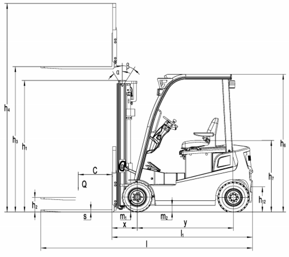 | Высота подъема h3 (мм) | Высота свободного подъема h2 (мм) | Габаритная высота мачты минимальная h1 (мм) | Габаритная высота мачты максимальная h4 (мм) | Наклон мачты/каретки вил вперед/назад α/β (º) | Остаточная грузоподъемность (кг) | |