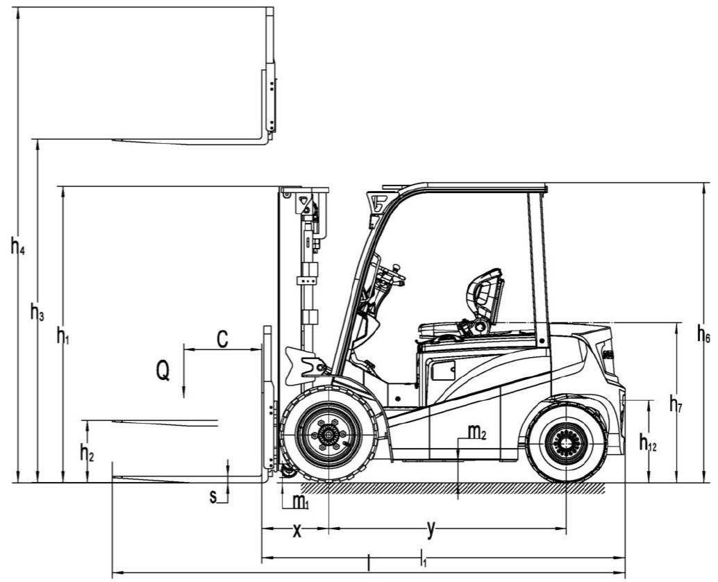 | Высота подъема h3 (мм) | Высота свободного подъема h2 (мм) | Габаритная высота мачты минимальная h1 (мм) | Габаритная высота мачты максимальная h4 (мм) | Наклон мачты/каретки вил вперед/назад α/β (º) | Остаточная грузоподъемность (кг) | |