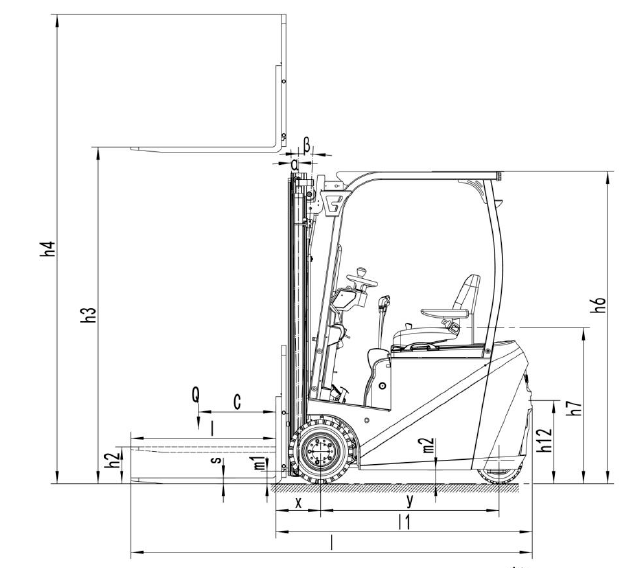 Высота подъема h3 (мм) Высота свободного подъема h2 (мм) Габаритная высота мачты минимальная h1 (мм) Габаритная высота мачты максимальная h4 (мм) Наклон мачты/каретки вил вперед/назад α/β (º) Остаточная грузоподъемность (кг)
