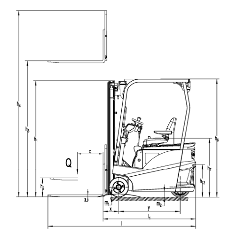 | Высота подъема h3 (мм) | Высота свободного подъема h2 (мм) | Габаритная высота мачты минимальная h1 (мм) | Габаритная высота мачты максимальная h4 (мм) | Наклон мачты/каретки вил вперед/назад α/β (º) | Остаточная грузоподъемность (кг) | |